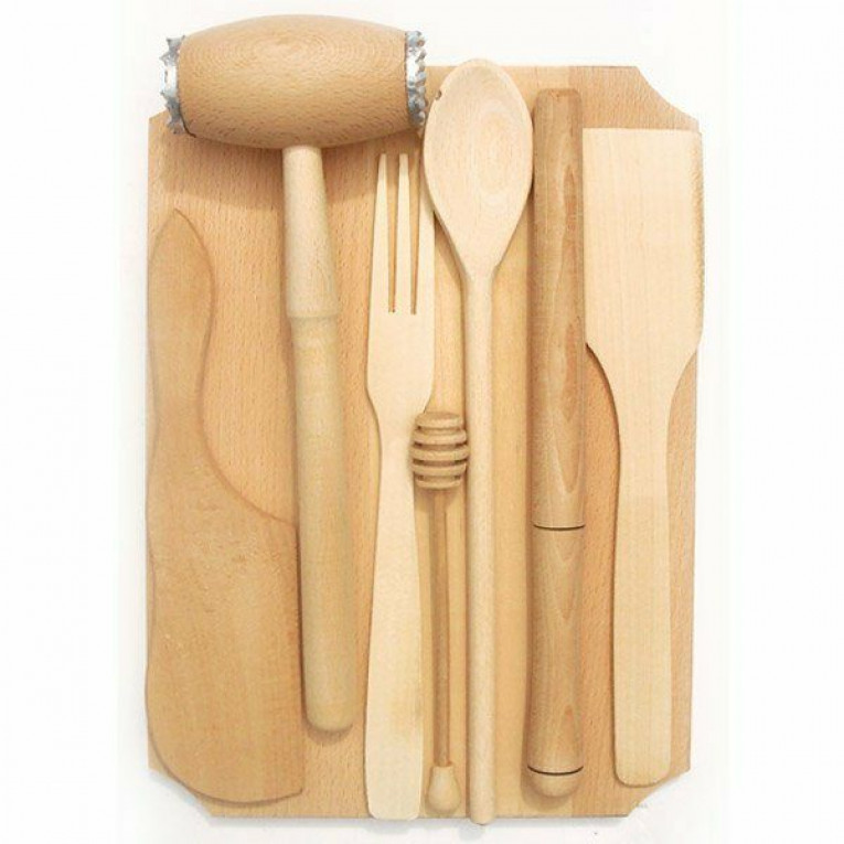 Rozmery: doska na krájanie: 25*25*1,5 cm; tĺčik na mäso: celková dĺžka 32 cm, rúčka 26 cm, hlava 10*4 cm; nôž: 25-7 cm; vidlička: 30*3 cm; medovka: 18 cm; vareška: 35 cm; špachtľa: 30*5,5 cm; drvič: 32*2 cm