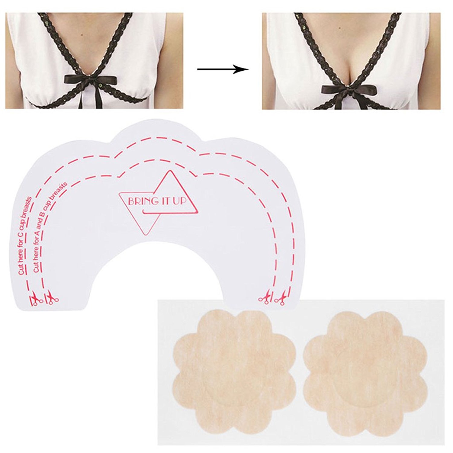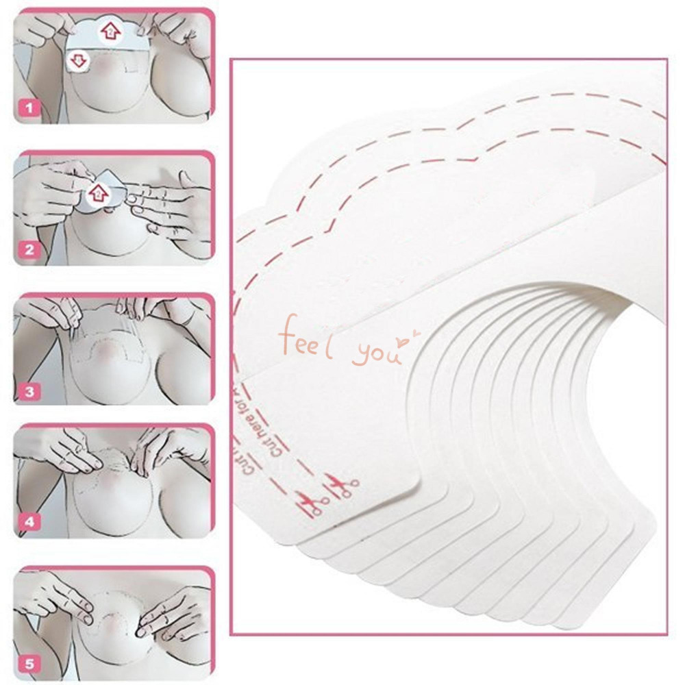 Aplikácia je jednoduchá: náplasť preloženú na polovicu prilep jednu časť nad bradavku, druhou časťou nadvihni prsia do požadovanej výšky a potom druhou časťou náplasť pripevni.