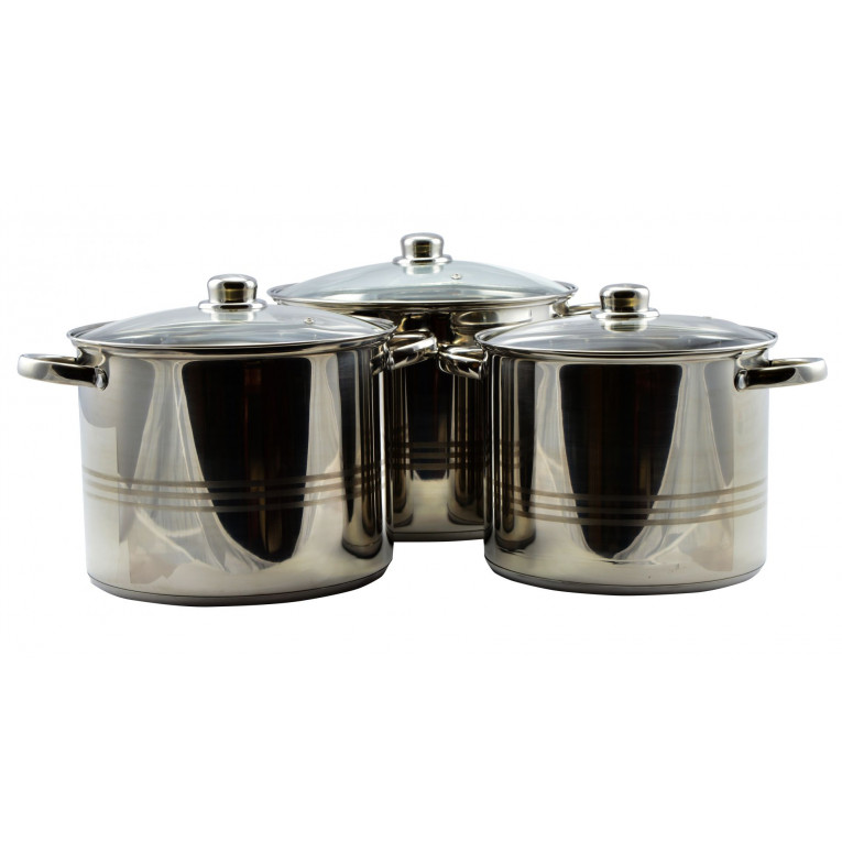 Rozmery hrncov: priemer 25,5 cm, výška 20 cm, šírka s rúčkami 34 cm; priemer 27,5 cm, výška 21,5 cm, šírka s rúčkami 36 cm; priemer 30 cm, výška 22,5 cm, šírka s rúčkami 38 cm