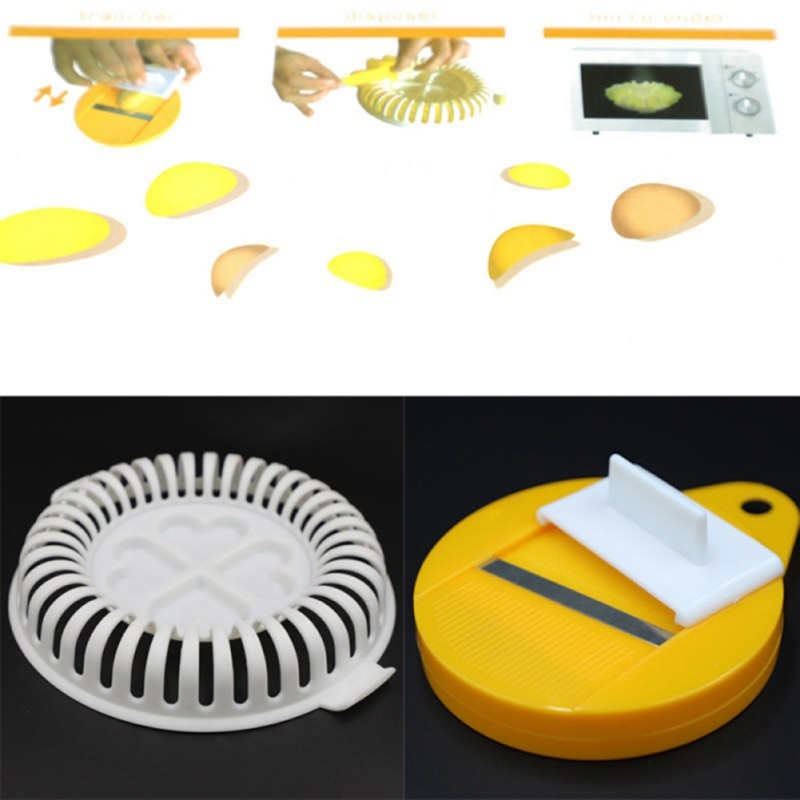 Nakrájaj zemiaky pomocou krájača. Takto získaš rovnomerné plátky, ktoré môžeš poukladať do držiaka. Keď si hotový, vlož držiak do mikrovlnnej rúry a upeč čipsy do chrumkava. Po ochutení môžeš konzumovať.