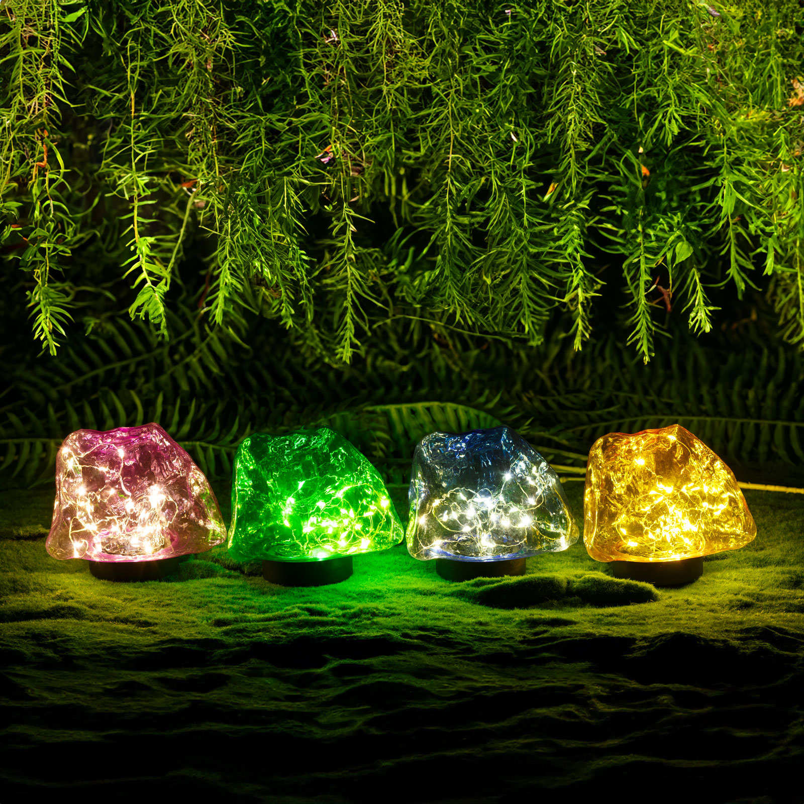 - 1ks Zapichovacia solárna lampa – tvar kameňa – farebná – 140 x 120 x 120 mm – teplá biela LED
